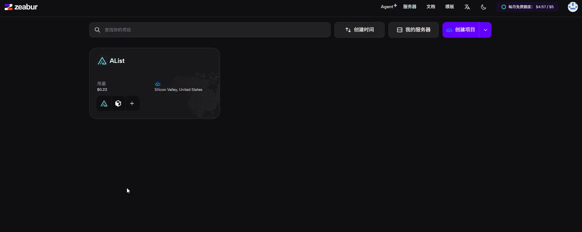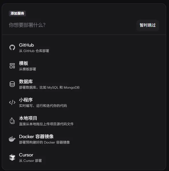 打开Zeabur的控制台,你可以看到有一个创建项目的按钮,点一下,就会到达这个界面。